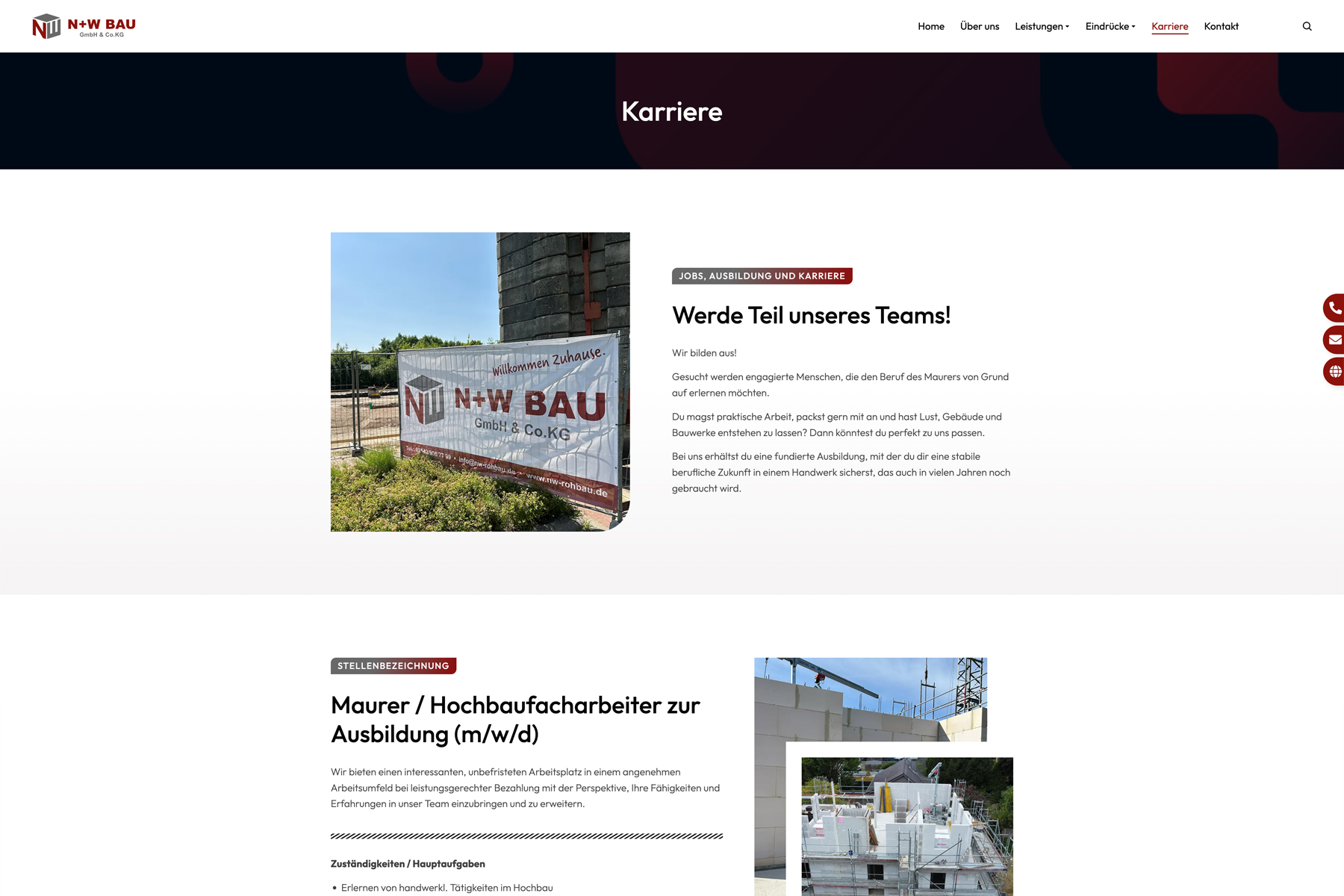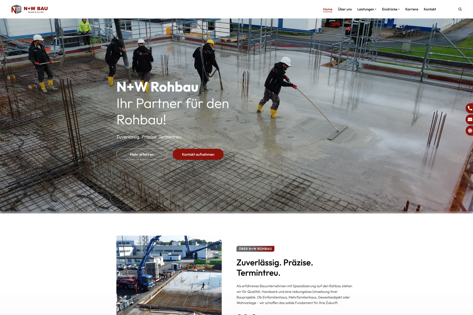 Für die N+W Bau GmbH haben wir eine WordPress-Website umgesetzt, die das Unternehmen klar und professionell präsentiert. Im Fokus stand eine übersichtliche Darstellung der Leistungen sowie eine verständliche Struktur für Interessenten und Auftraggeber.