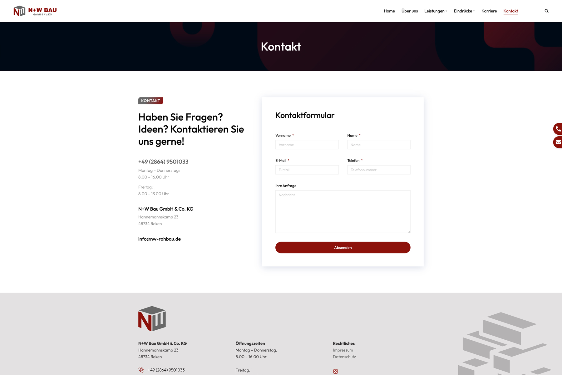 Das Ergebnis ist eine professionelle Unternehmenswebsite, die Vertrauen schafft und Orientierung bietet. Die klare Struktur unterstützt Interessenten dabei, relevante Informationen schnell zu finden und erleichtert der N+W Bau GmbH die digitale Präsentation des Unternehmens.